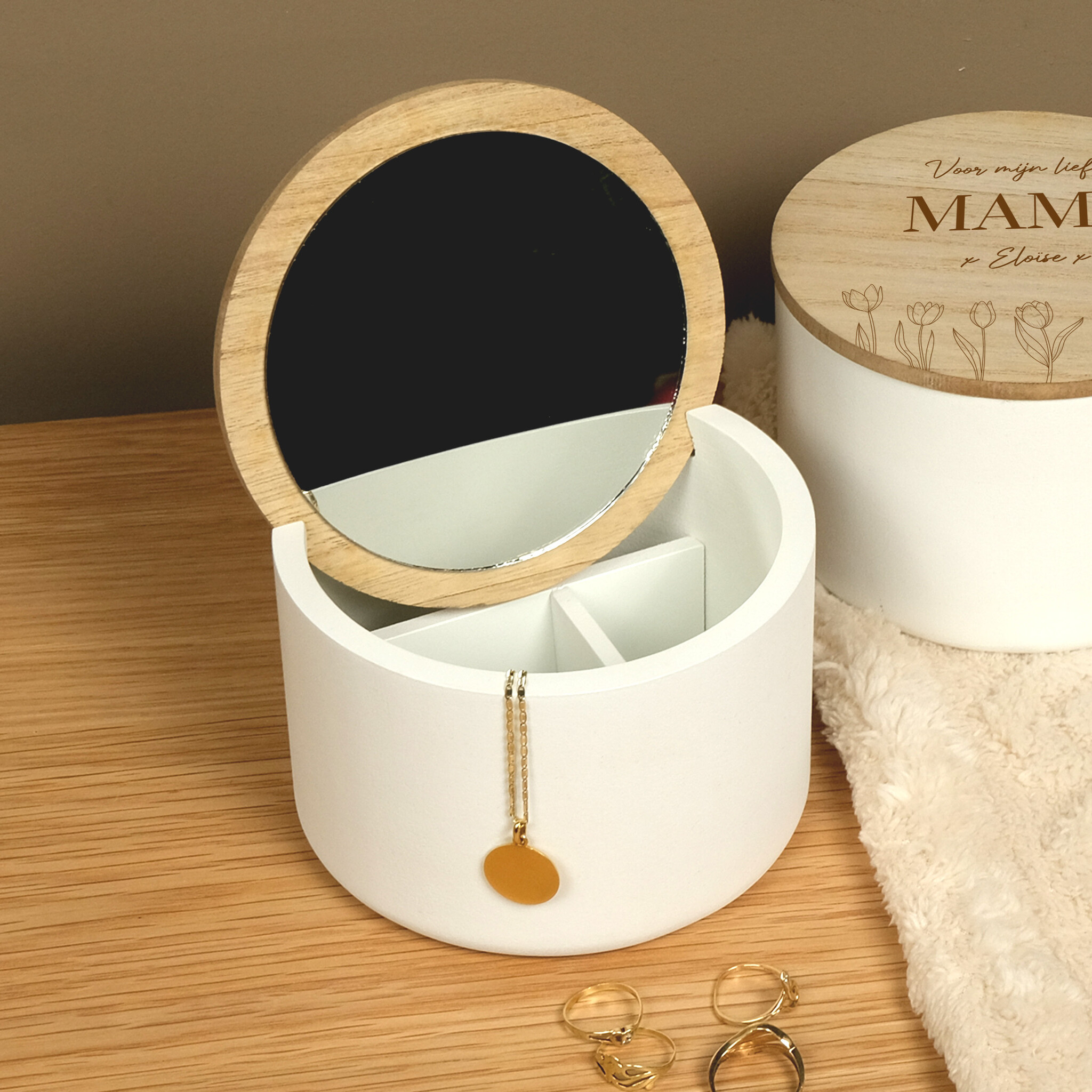 Op zoek naar een origineel en functioneel cadeau? Dit ronde, houten sieradendoosje is een echte blikvanger. Het strakke design past in elk interieur, van modern tot klassiek. Meer info
