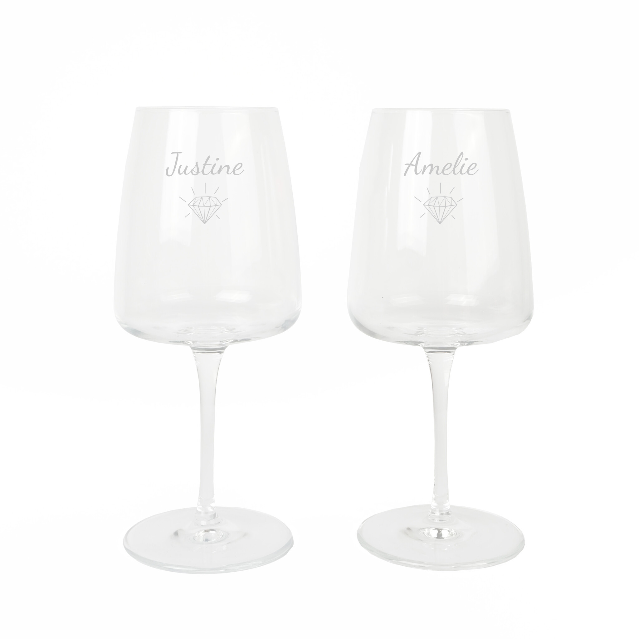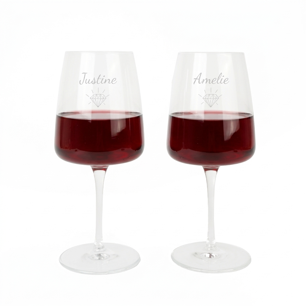 Prachtige, moderne rode wijnglazen, gegraveerd met eigen tekst. Meer info